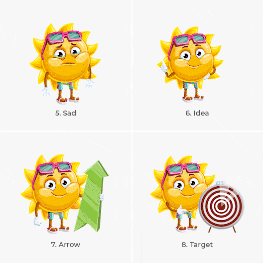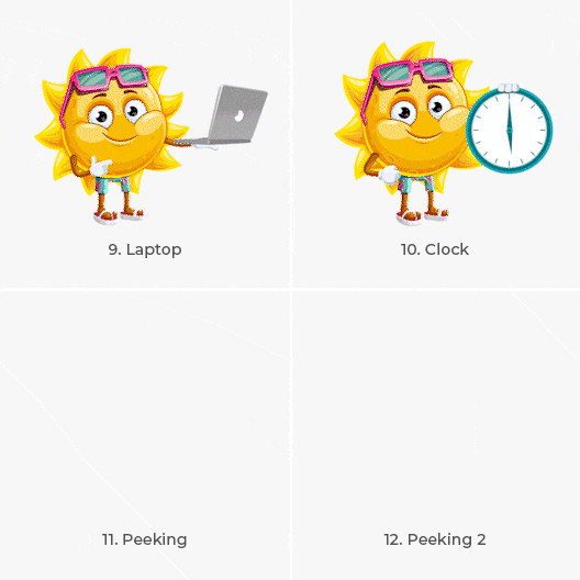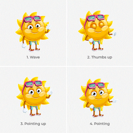 Prepare for your summer campaigns with our new cartoon sun animated pack. Including 12 animated GIFs, that are ready to use in most software, this sunny character can point, show, give thumbs up, and more.