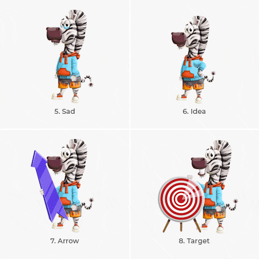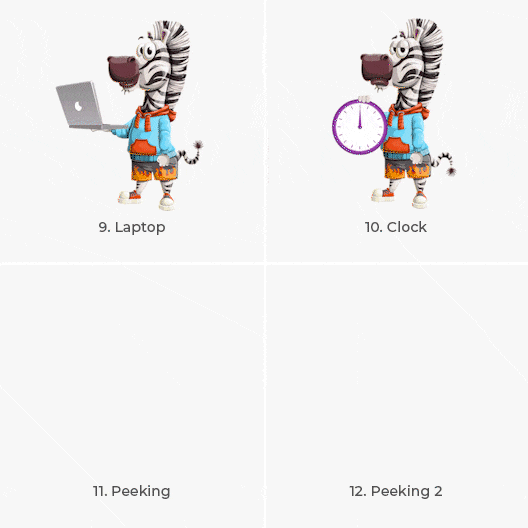 Have a look at our striped, sneaky zebra character. This funny cartoon zebra is coming in a collection of 12 different animations available in GIF format. This wild cartoon animal gives a thumbs-up, points in different directions, and holds items like a laptop and an arrow.