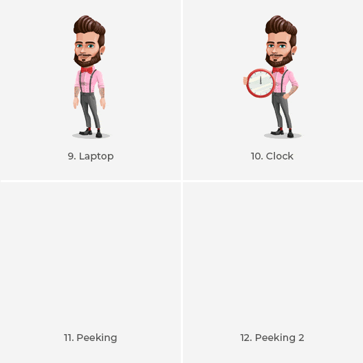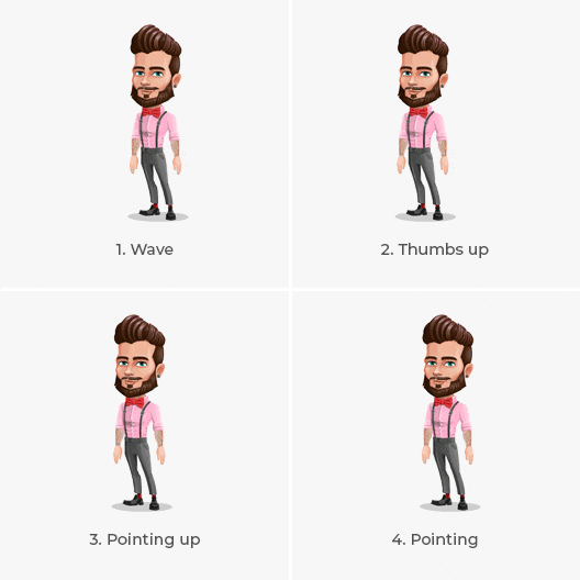 This set features 12 animated GIFs of a very rebellious and fashionable smart man with a bow tie, cool beard, and tattoos. He packs different presentational poses such as waving, pointing, thumbs up, as well as target and arrow concepts.