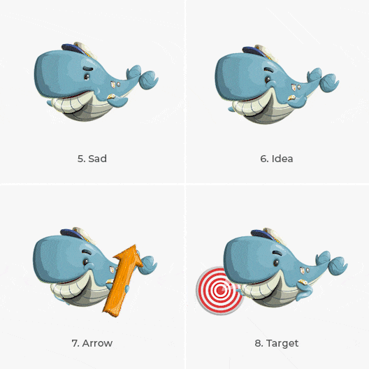 A charming cartoon whale character, available in 12 different animated GIFs and performing different actions. This cool whale can point, give thumbs up, hold a laptop, an arrow, and more. All of the actions are available as transparent animated GIFs that can be used in many different projects.