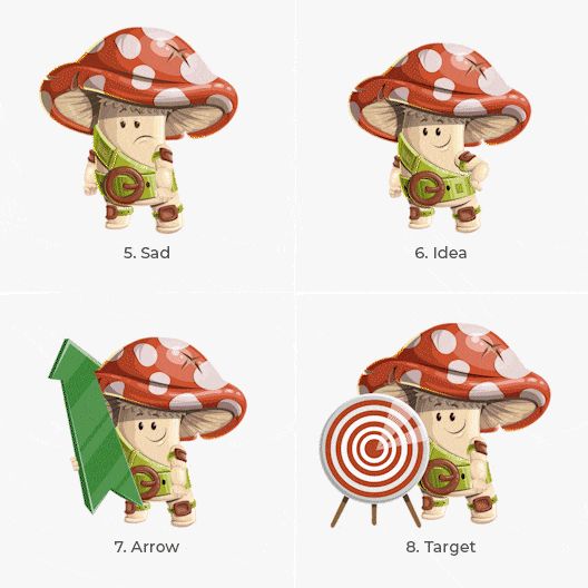 A charming little mushroom cartoon character, prepared in a set of 12 ready-to-use Animated GIFs. You can use this mushroom animated character in a wide range of projects with all the actions included in the pack. You will find waving, giving thumbs up, pointing, coming up with an idea, and many more.