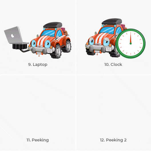 An adorable cartoony car character developed in an animated set of 12 ready-to-use poses. The pack includes 12 animated poses such as pointing, saying hello, giving thumbs up, and more, all available as universal GIF file format.