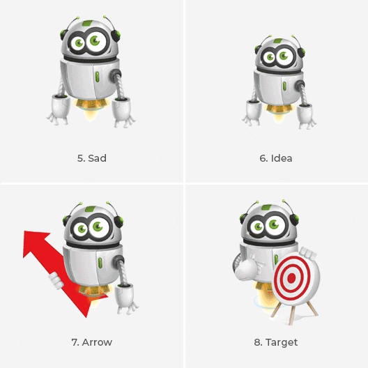 There is not a single reason why you shouldn't put a robot character in your presentation. Robots are fun, cool, and everybody loves them. This little guy is jet-packed with 12 different presentational animations and emotions in GIF format and is easy to import into any project.