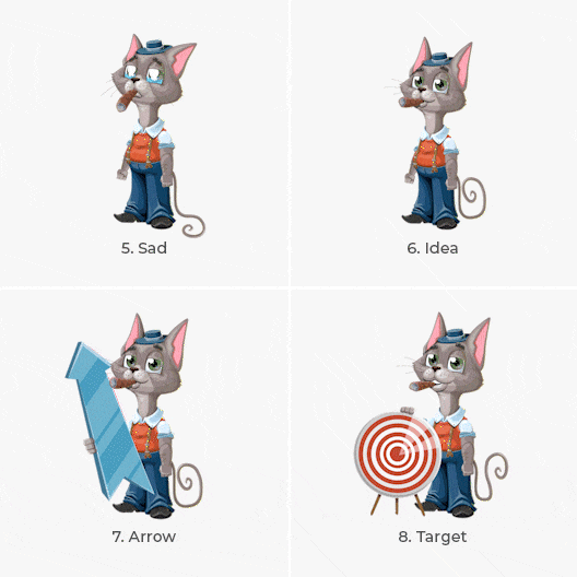 An old-school gangster cat, that is going to make your presentations and designs more fun. This funny cartoon cat character includes 12 animated GIF files, that are designed to fit many user cases, so you will find a waving animation, giving thumbs up animation, pointing, and many more.