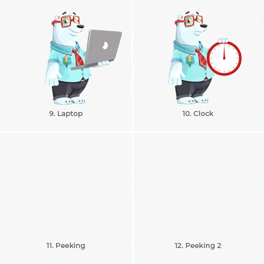 A charming bear, that is ready to give you thumbs up, or hold a laptop for you! Available in a set of 12 different ready-to-use GIF animations, this polar bear would be a great addition to any design, such as PowerPoint presentation or a social media post.
