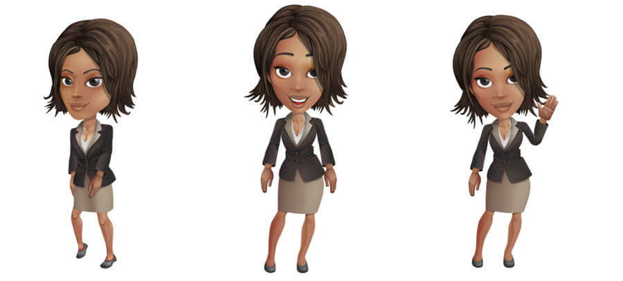 An African American businesswoman character rigged as an Adobe Character Animator puppet with advanced features. The pre-made triggers include waving, pointing, and giving thumbs up. This puppet lipsync your words and express emotions as you speak on the mic and cam. The download file includes Ai and Puppet file formats.