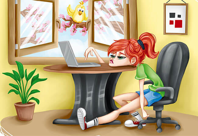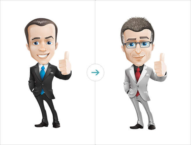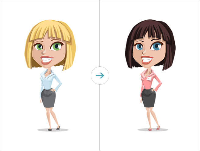 “I need a few color changes of this girl vector character. Can you make her a brunette with blue eyes and her outfit matching our company colors? Thanks!”