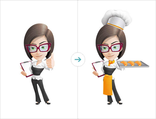 “I need this business woman character look like a cook. Can you add a chef’s hat, an apron, a scarf and a tray with croissants in the hand? I need the accessories in the company’s color: orange.”