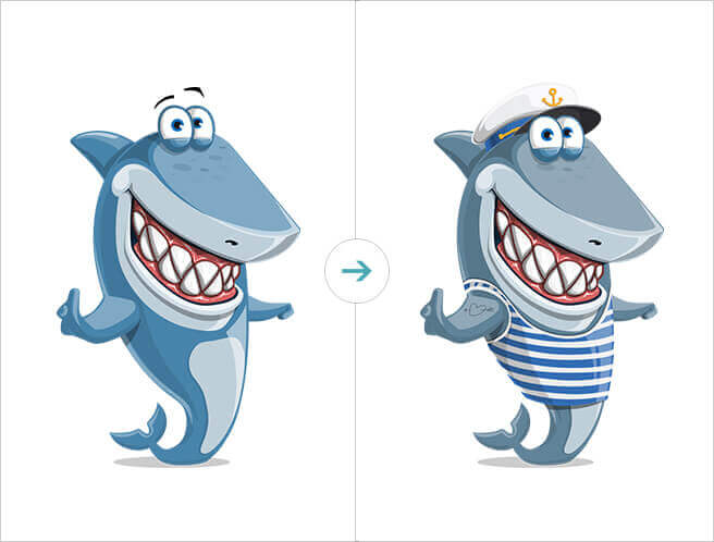 “I need this shark character dressed up as a sailor. Can you add a striped sailor T-shirt, a sailor hat and a pierced heart tattoo on its shoulder? I also need the shark color more greyish.”